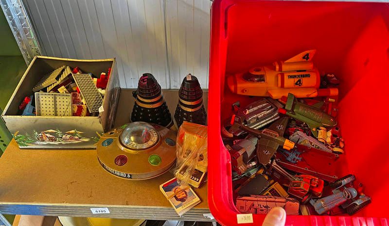 Vintage lego, thunderbirds toys, doctor who toys, etc over one shelf