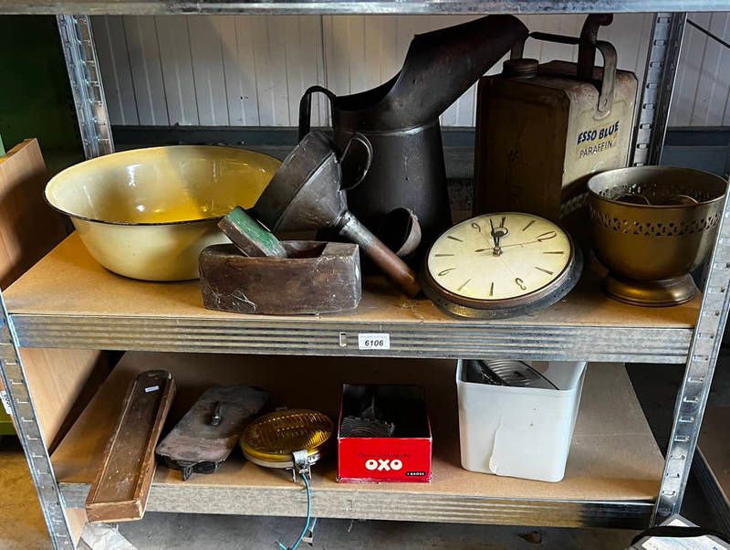 Valor can, oil can, funnels, automotive lights, etc on 2 shelves