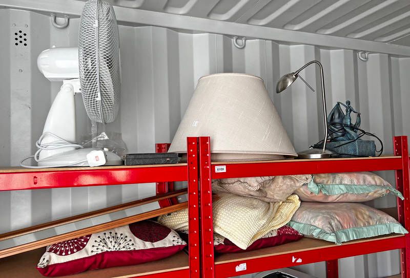 Cushions, electric fan, shades, etc over 4 shelves
