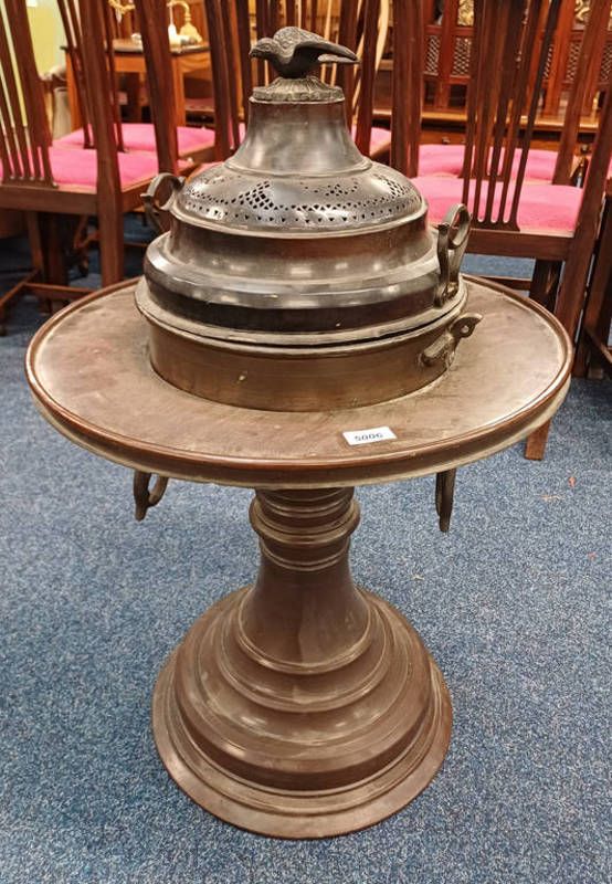 Middle eastern bronzed brazier with nested bird finial on centre pedestal with circular base