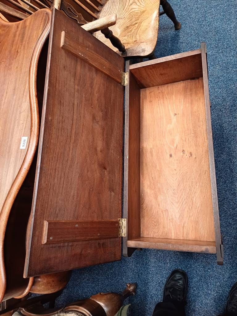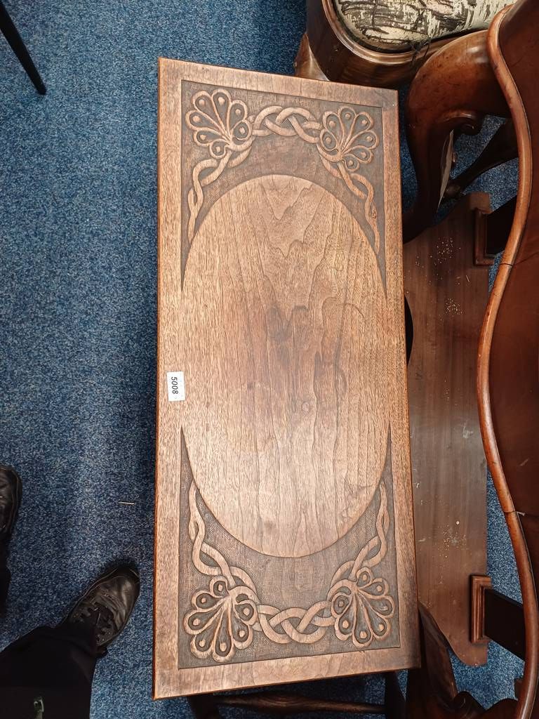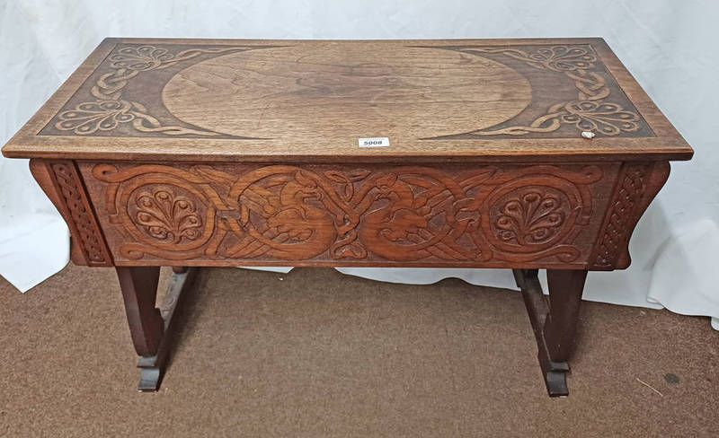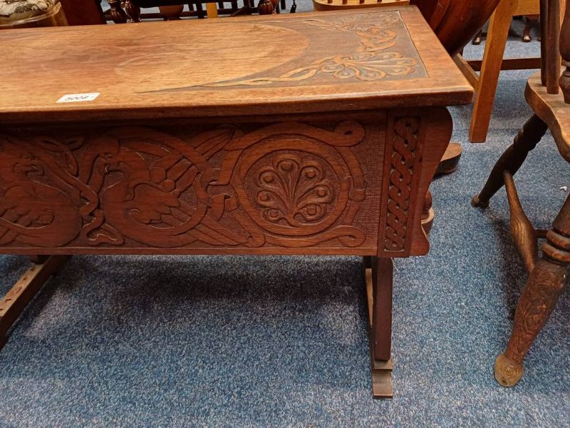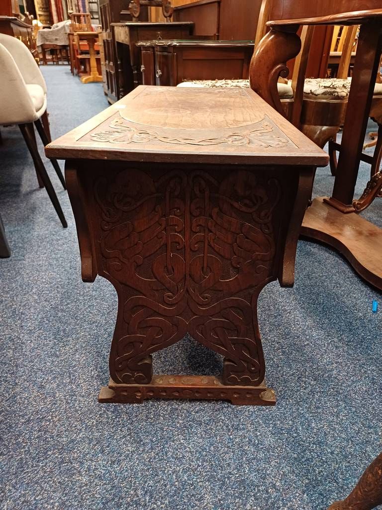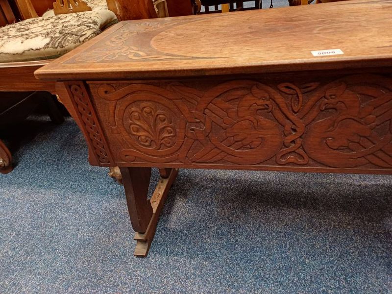20th century coffer with decorative carving & poker work on shaped supports in the arts & crafts style. 51 cm tall x 84 cm wide