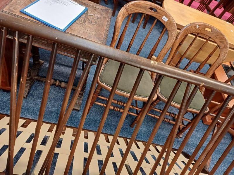 Pair of early 20th century oak spindle back chairs with padded seats on turned supports