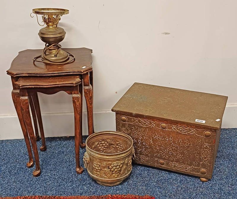 Embossed brass coal box in the arts & crafts style, embossed brass planter with lion mask handles, etc