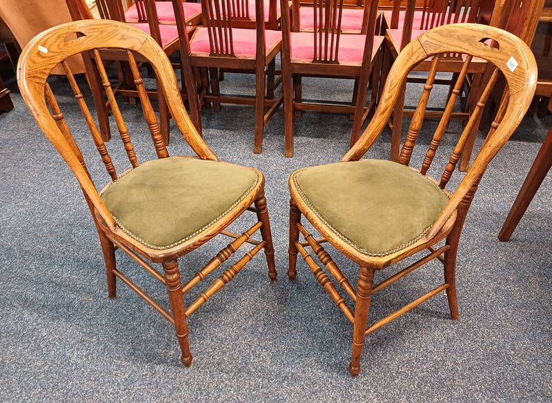 Pair of early 20th century oak spindle back chairs with padded seats on turned supports