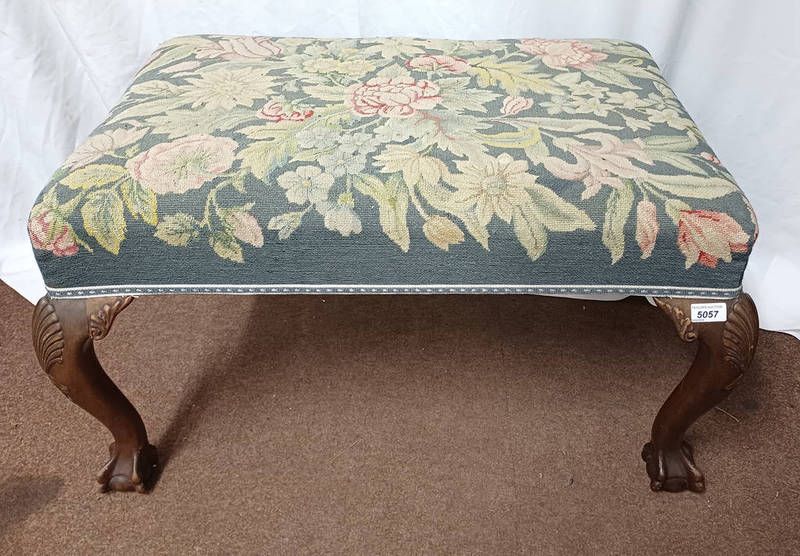 Late 19th or early 20th century large mahogany rectangular stool with floral tapestry seat on ball & claw supports