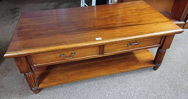 Late 20th century mahogany rectangular coffee table with 2 drawers on fluted supports with undershelf - 120 cm long