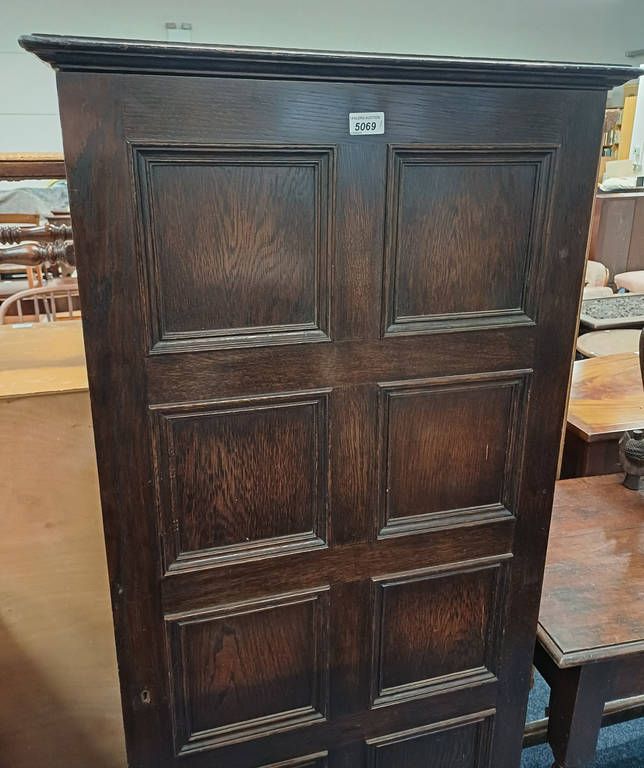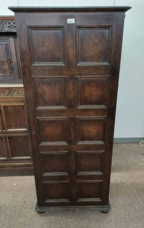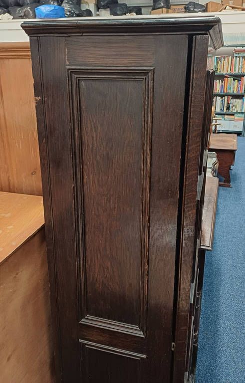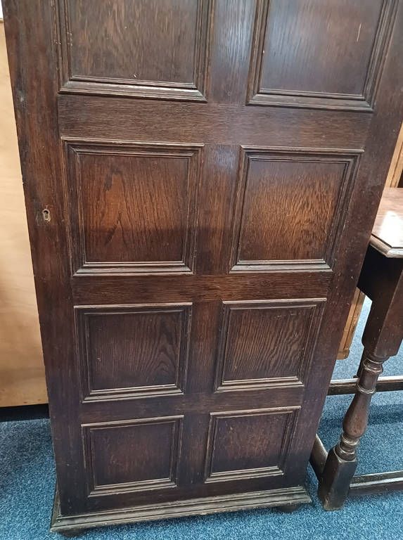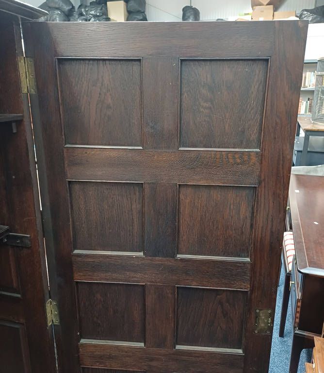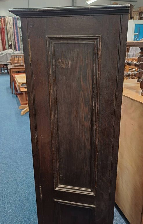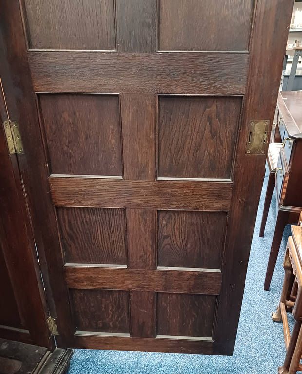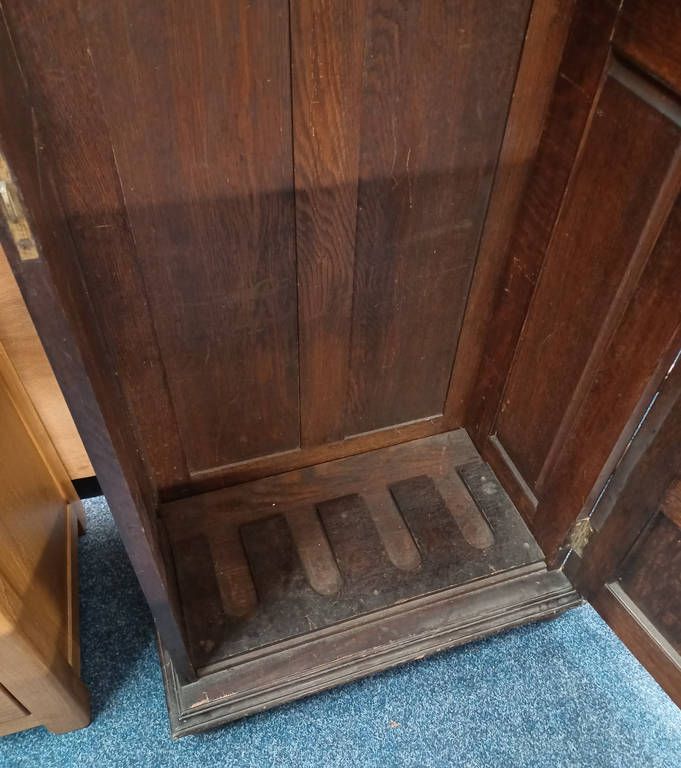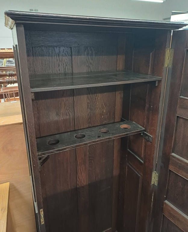 Early 20th century oak gun cabinet with fitted interior behind single panel door - 154 cm tall x 64 cm wide