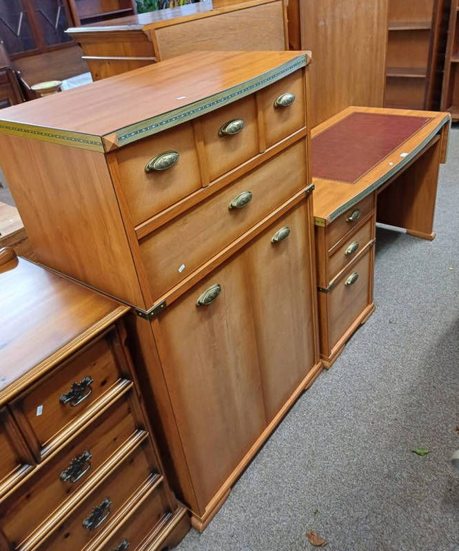 Modern desk with drop flap, slide & 3 drawer by gautier and matching cabinet with 2 drawers over 2 panel doors