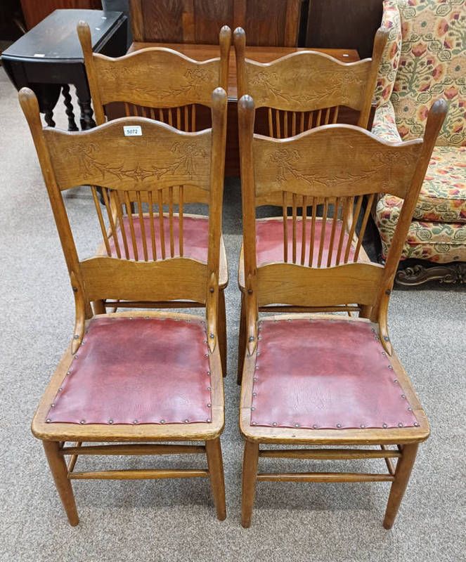 Pair of early 20th century oak spindle back chairs with padded seats on turned supports