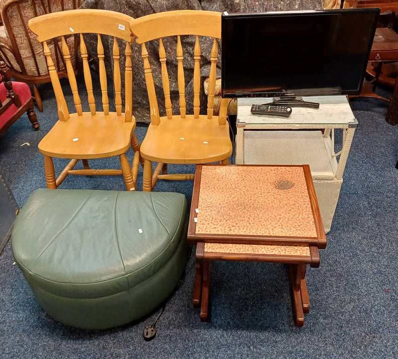 Pair of pine spindle back kitchen chairs, nest of 2 g-plan tables with copper inset tops, tv, etc