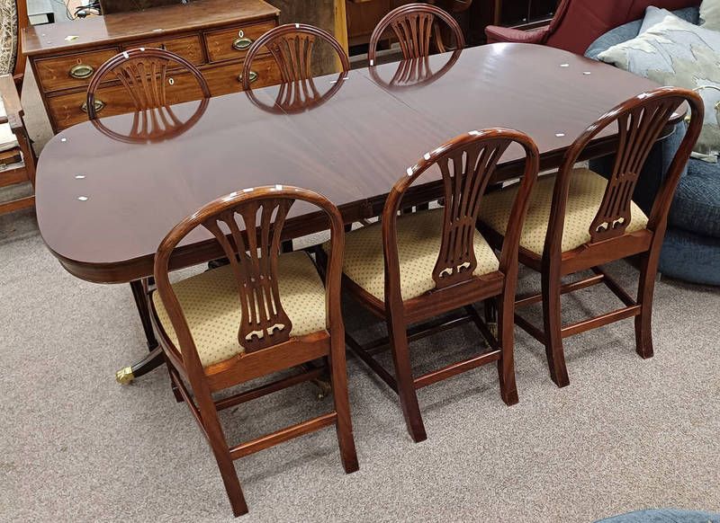 Late 20th century mahogany twin pedestal extending dining table & set of 6 dining chairs on square tapered supports - 195 cm long extended