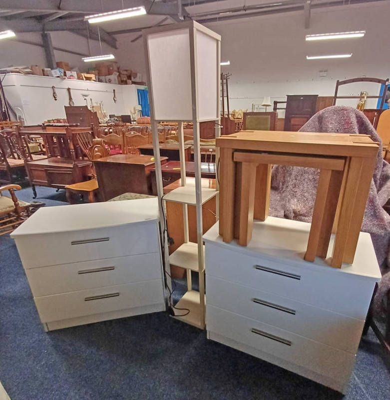 Pair of white 3 drawer chests, nest of 2 oak tables, etc - chests 69 cm tall x 77 cm wide