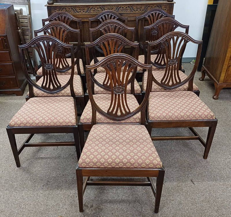 Set of 10 mahogany dining chairs with shaped fret work backs on square tapering supports