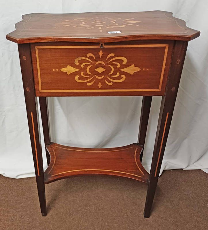 Early 20th century inlaid mahogany table with shaped lift lid top on square tapering supports