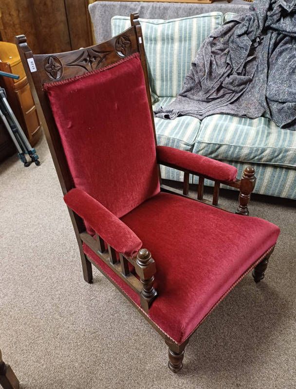 Early 20th century mahogany framed 3 piece wingback suite with shaped back on decorative carved...