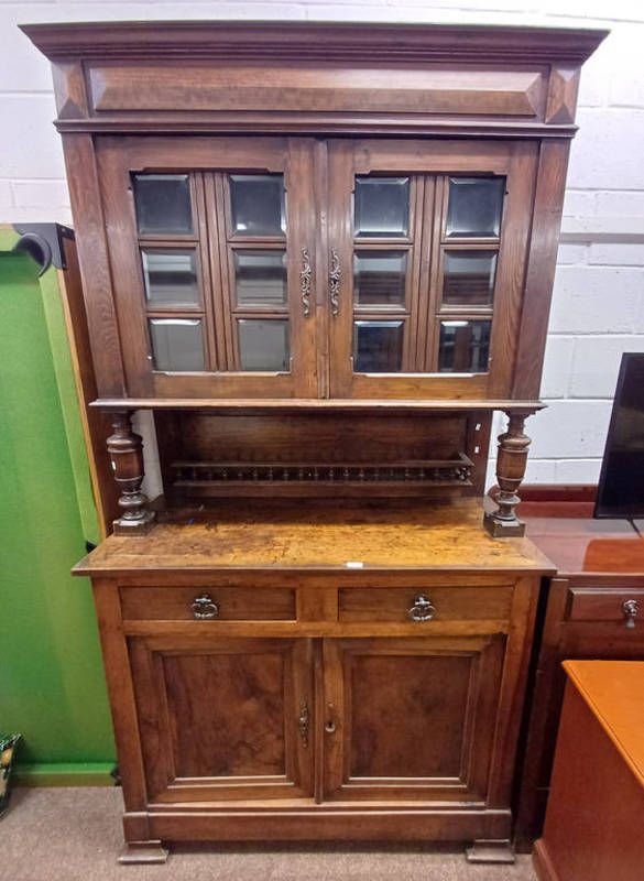 19th century pine & beech dresser with 2 glazed panel doors over base of 2 drawers over 2 panel doors - 220 cm tall