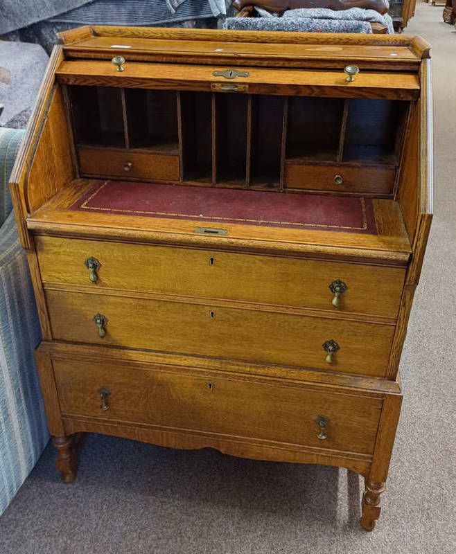 Early 20th century oak bureau bookcase with 2 leaded glass doors over fall front &...