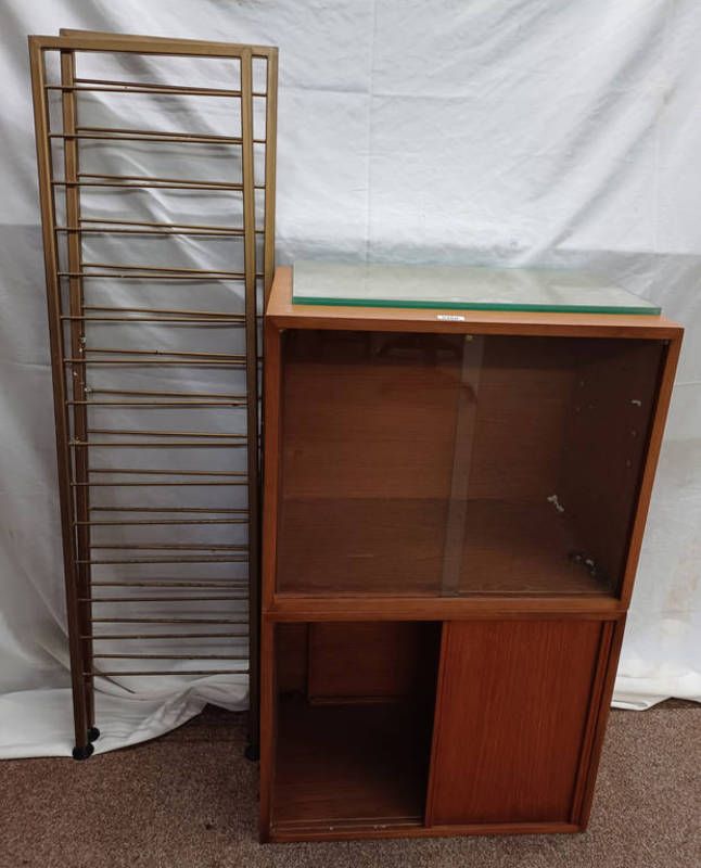Teak ladderax unit with 2 glass sliding doors & 2 sliding doors, 2 metal ends & 4 shelf rails