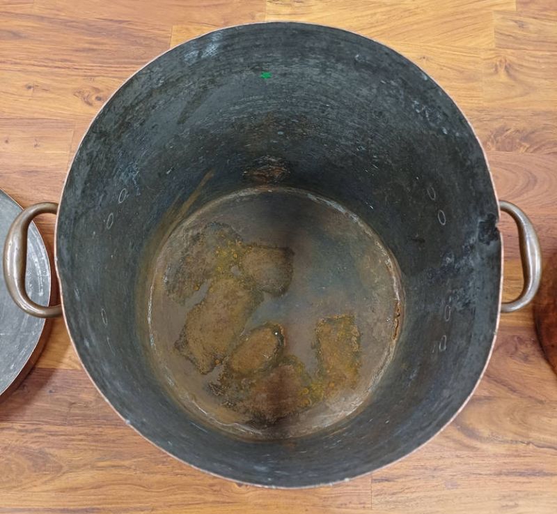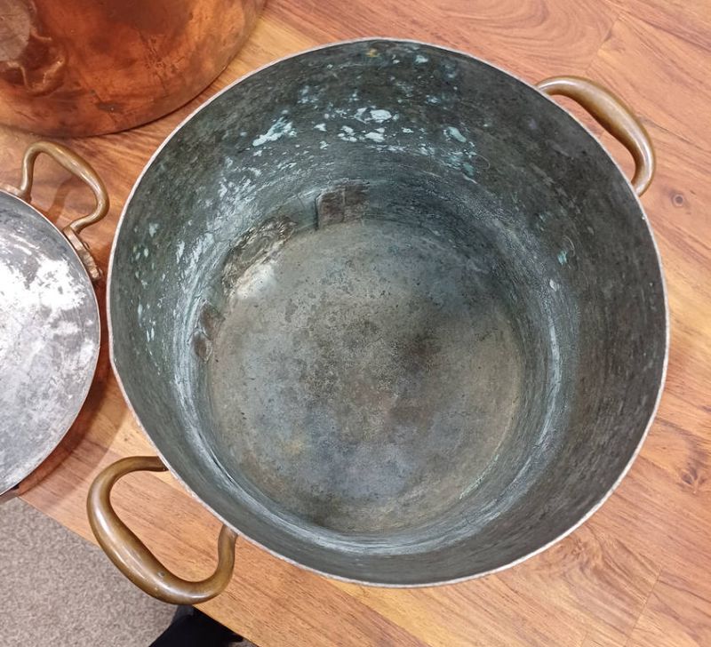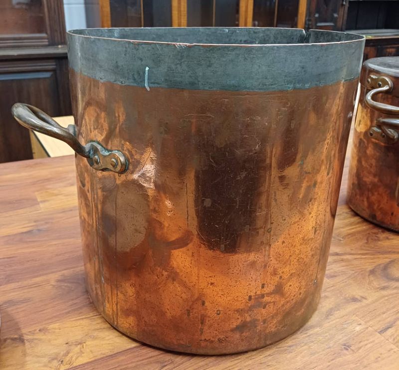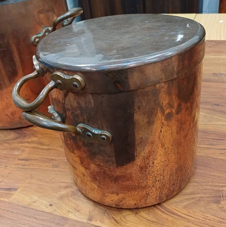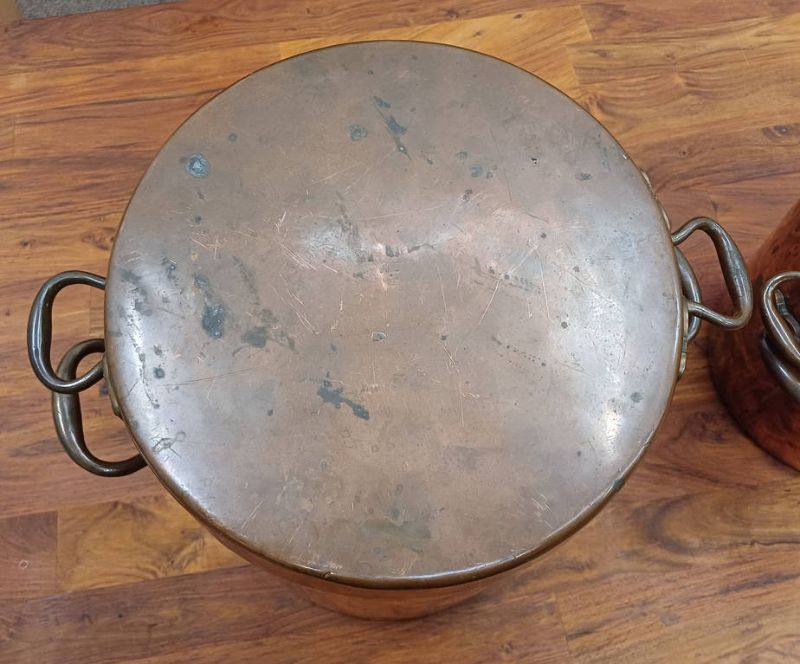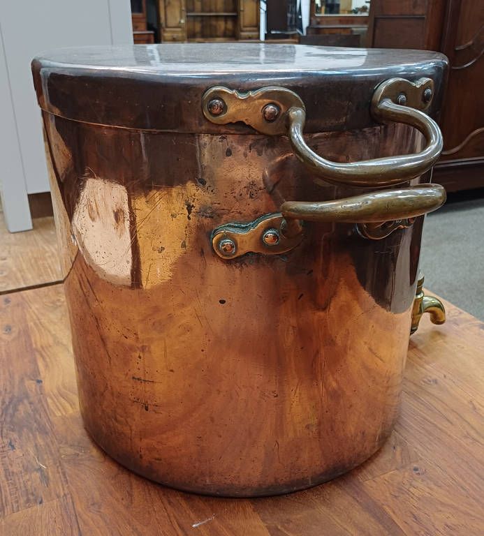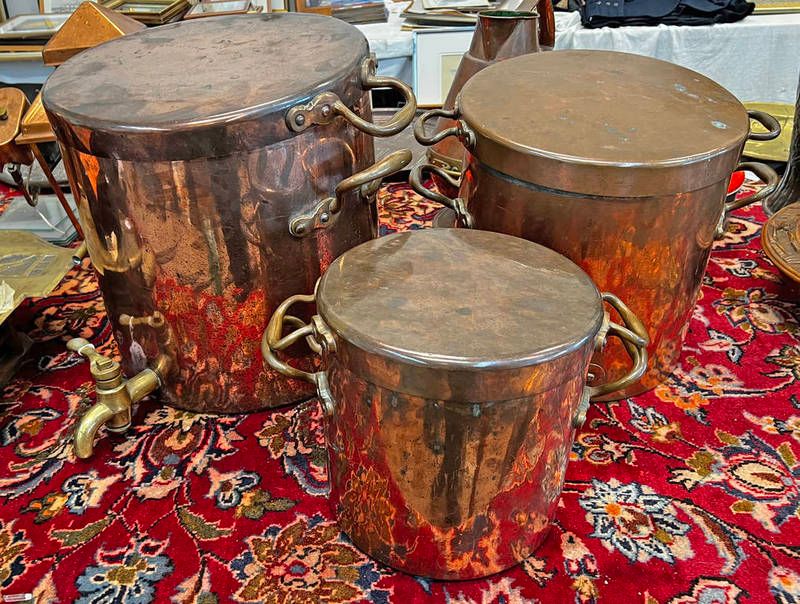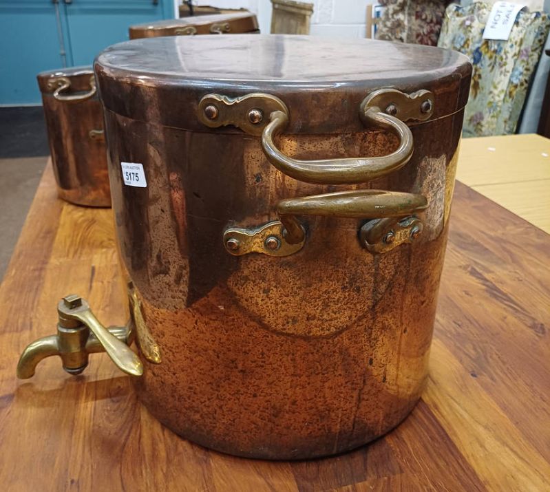 3 copper & brass graduated water urns / pots. all with lids, one with brass spout, tallest 38cm