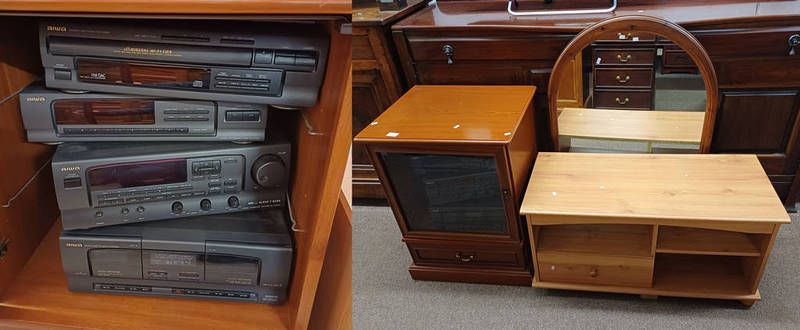 Media cabinet with aiwa stereo system, tv unit and pine overmantle mirror