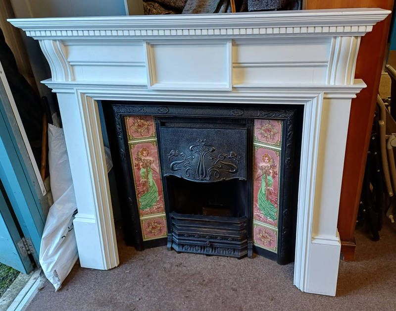 Art nouveau style fireplace with classical figure tile insets & painted surround with dentil cornice - total size 128 cm tall x 138 cm wide