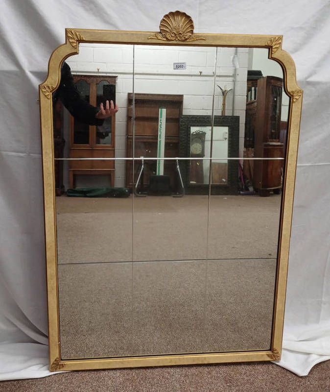 Decorative gilt famed mirror with shell finial, glass 106 x 75 cm