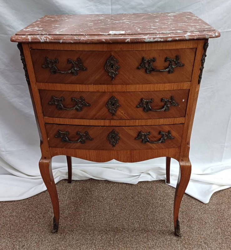Continental kingwood marble topped 3 drawer chest with brass ormolu fittings on splayed supports