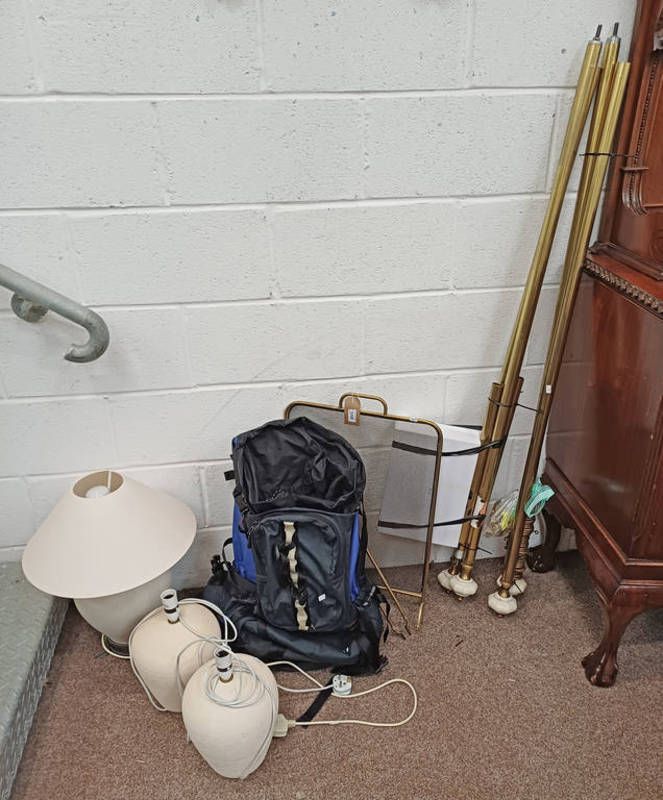Pair of brass curtain poles with porcelain finials, fire guard, 3 porcelain table lamps etc