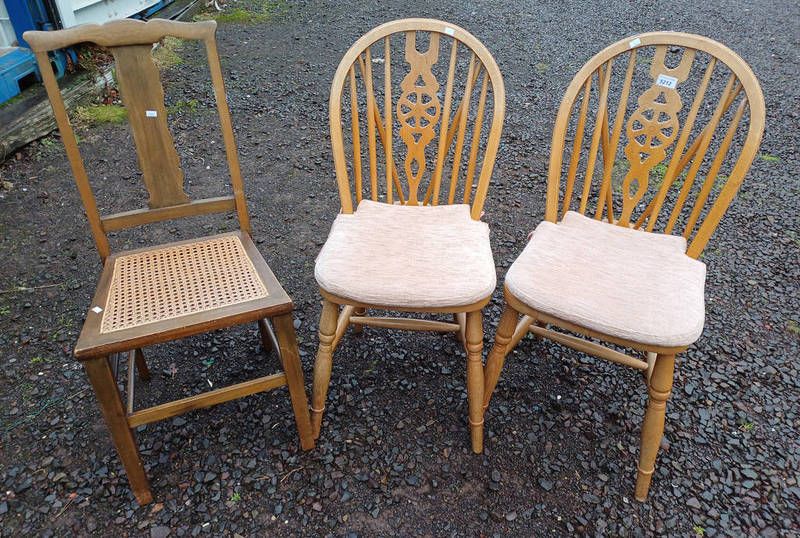 Pair of oak wheel back dining chairs and mahogany hand chair with bergere seat