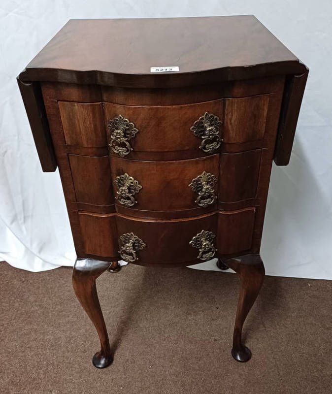 20th century walnut 3 drawer bedside chest with shaped front & 2 drop flaps on queen anne supports, 70cm tall