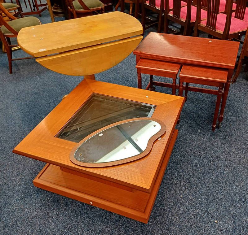 Nest of 3 mahogany tables, teak square coffee table with glass inset top, etc