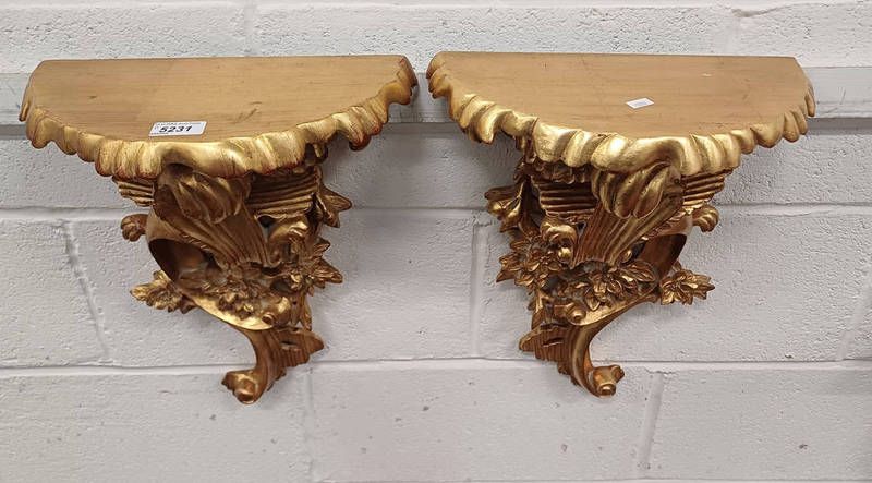 Pair of ornate carved gilt demi-lune wall shelves - 45 cm tall x 34 cm wide