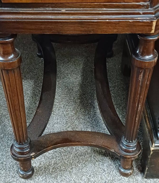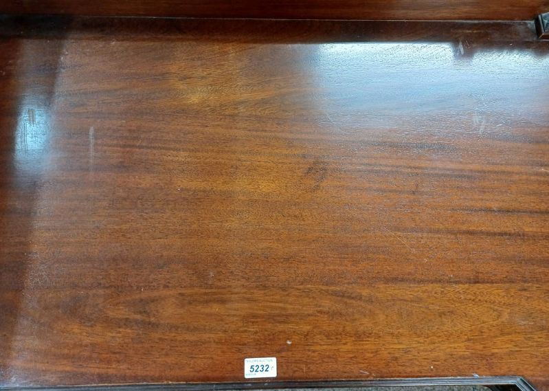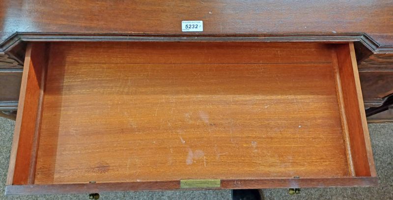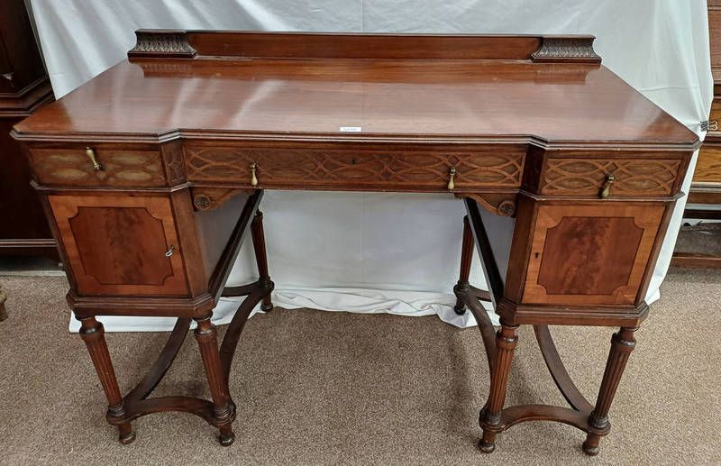 20th century mahogany dressing table with 3 drawers over 2 panel doors on reeded supports with understretchers, 122cm wide