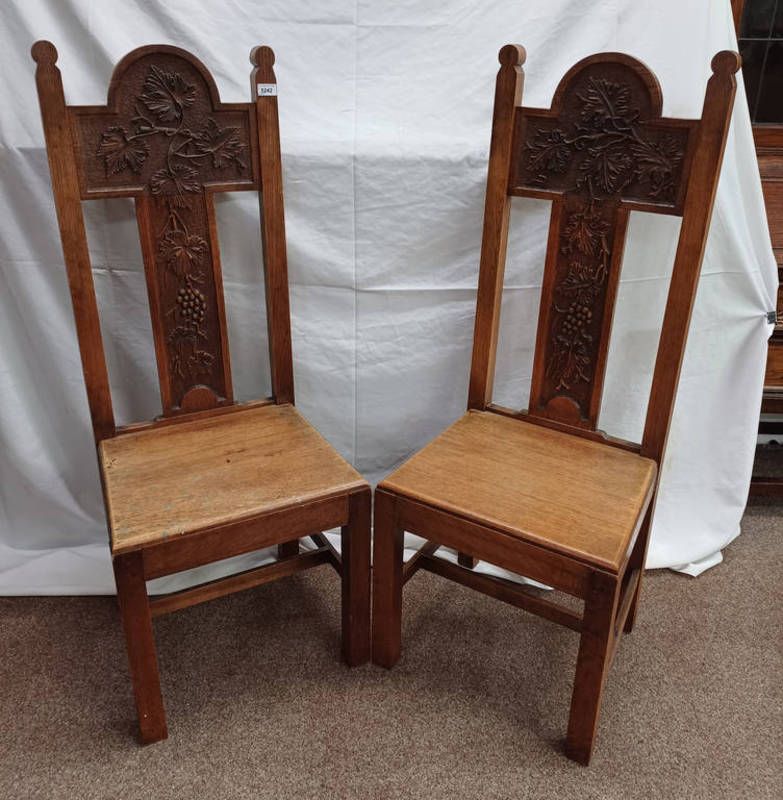 Pair of oak hall chairs with carved foliage & grape poker work on square supports