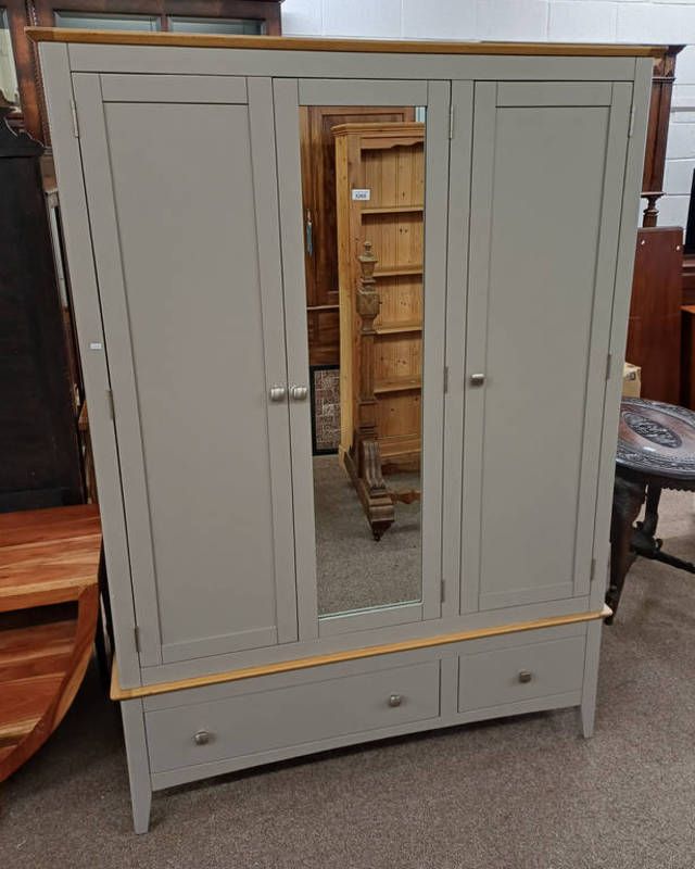 Off white & oak wardrobe with centrally set mirror door flanked by 2 panel doors with 2 drawers to base - 186 cm tall x 132 cm wide