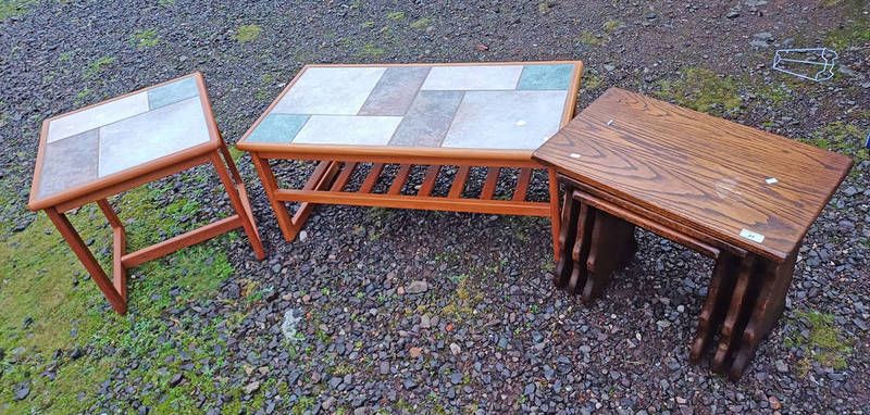 Teak coffee table with tile inset top, matching occasional table & nest of 3 oak tables