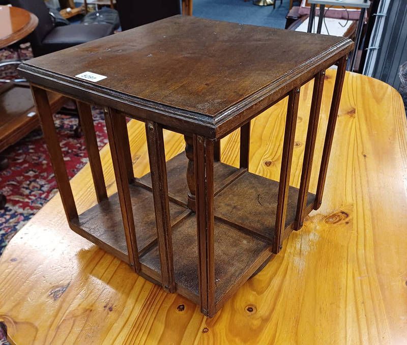 20th century mahogany table top revolving bookcase, 34cm tall x 35cm wide