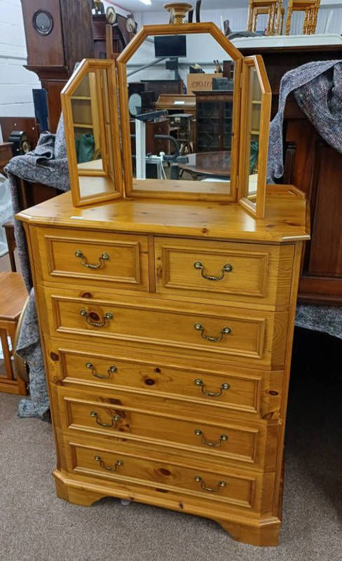 Pine chest of 2 short over 4 long drawers & triptych mirror - 124 cm tall x 90 cm wide