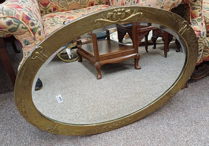 Early 20th century brass framed oval mirror with bevelled edge in the arts and crafts style - glass 74 cm x 50 cm