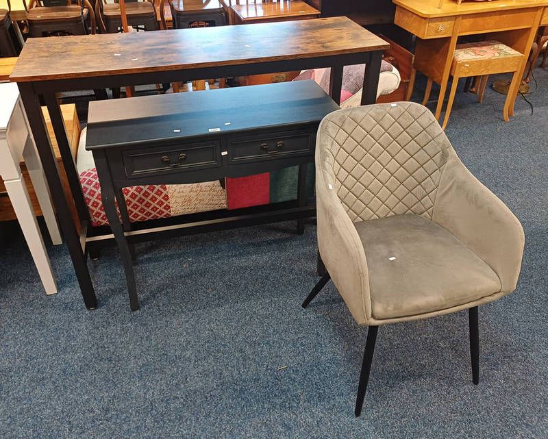 Painted side table with 2 drawers on shaped supports, overstuffed chair, etc.