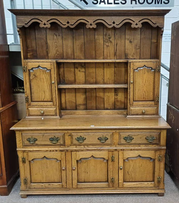 20th century oak welsh dresser, the shelf back with 2 panel doors over 2 drawers, the base with 3 drawers over 3 panel doors, 203cm tall x 168cm wide