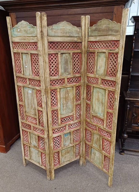 Rustic eastern style 3 part folding room divider with fret work panels - 183 cm tall