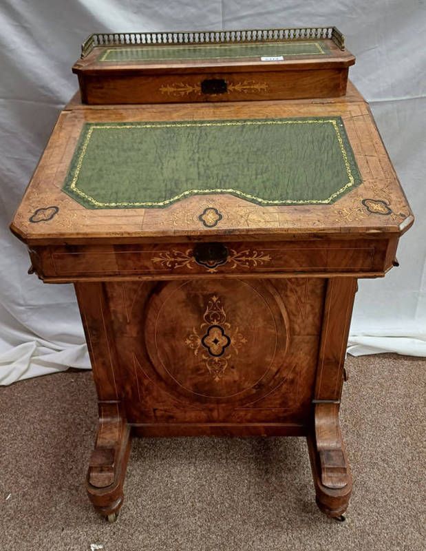 19th century inlaid walnut davenport with leather inset slope & gallery opening to fitted interiors & 4 drawers to right side, 87cm tall x 55cm wide