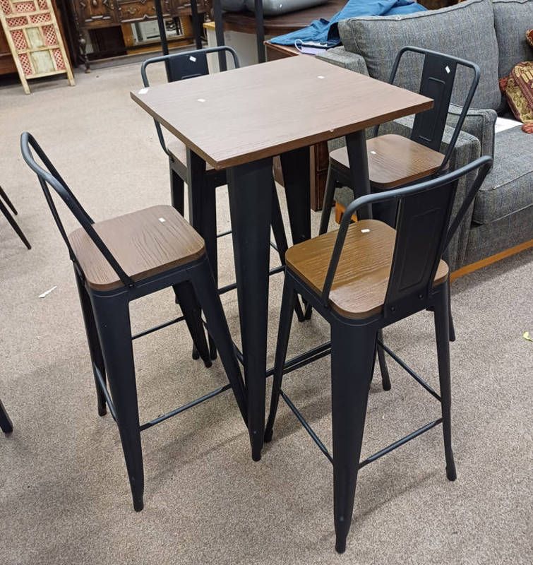 Wood topped square table on metal supports & 4 matching bar stools