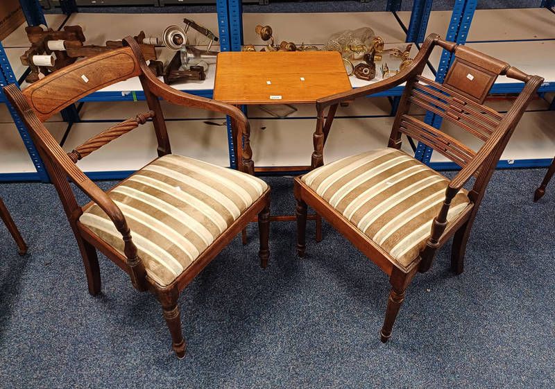 Late 19th century inlaid mahogany open armchair on ring turned supports, folding table & one other armchair