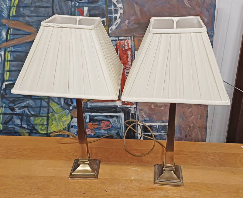 Pair of metal table lamps on square stepped bases