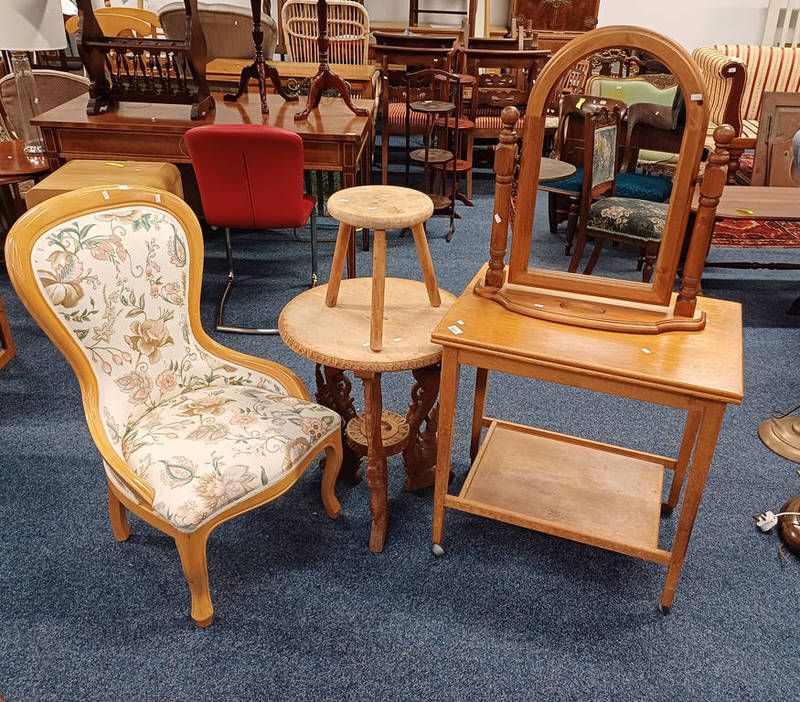 Oak 2 tier trolley, eastern circular occasional table, joint stool, etc.