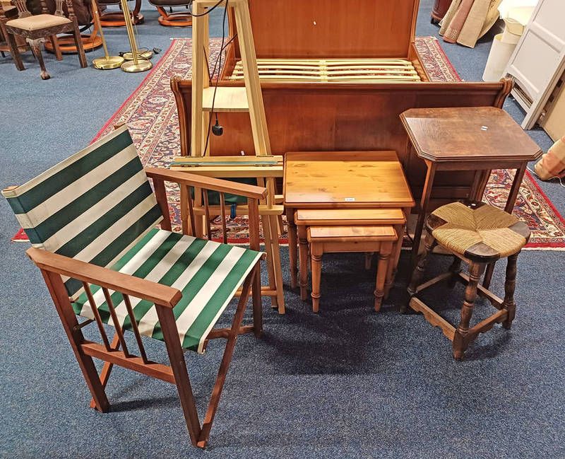 Oak occasional table, nest of 3 pine tables, standard lamp etc.