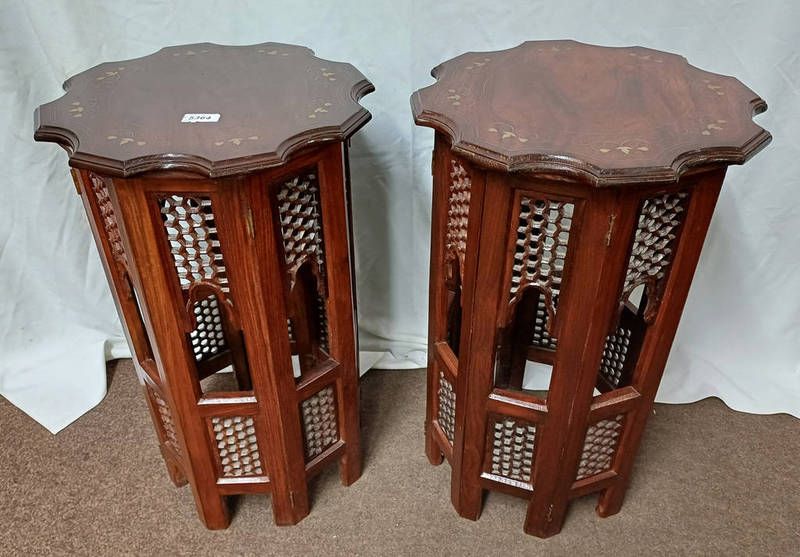 Pair of eastern hardwood occasional tables with shaped tops & decorative brass inlay
