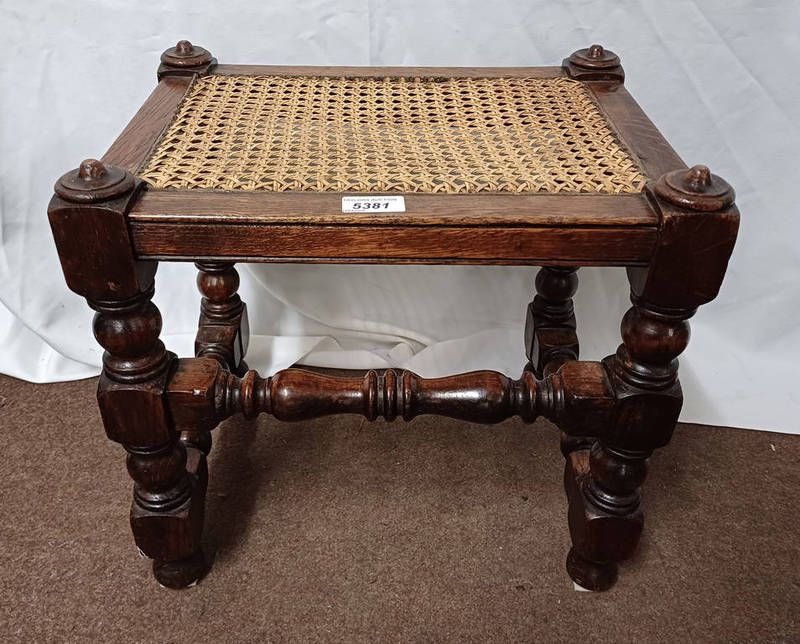 Early 20th century oak bergere topped stool on turned supports